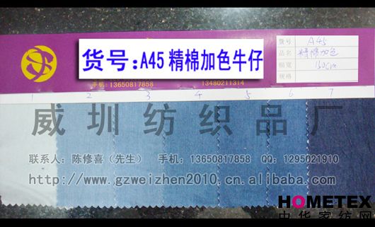 織物組織:平紋 幅寬:150cm 品名:純棉牛仔 密度:64*47 水洗工藝:砂洗 貨號(hào):A45精棉加色 重量:* 具體用途:休閑服、工作服、褲裝、時(shí)裝 別名:A45精棉加色 印染工藝:印花 成分及含量:100%棉 主要用途:服裝用布 ======================================================================= 以上產(chǎn)品全部現(xiàn)貨供應(yīng),可隨時(shí)提供樣布卡和現(xiàn)貨,隨時(shí)發(fā)貨。所有產(chǎn)品全部是廠家直銷(xiāo)價(jià),我們承諾:以超低利潤(rùn)營(yíng)銷(xiāo),我 們只求銷(xiāo)售量。為保證您的利益,我司建議您在采購(gòu)前先確認(rèn)我們的品質(zhì)樣與顏色樣后再拿大貨,期待與您的真誠(chéng)合作。因產(chǎn) 品種類(lèi)較多,具體參考未盡詳盡,如有需要,請(qǐng)您與我們聯(lián)系。 瑞豐紡織(中大旗艦店)坐落于國(guó)內(nèi)最大的紡織面料產(chǎn)業(yè)中心—廣州中大,是一家專(zhuān)業(yè)銷(xiāo)售面料的廠家直銷(xiāo)商。主要經(jīng) 營(yíng)產(chǎn)品有:全棉凈色、仿記憶絲面料、全棉(TC)色織等,面料品種花達(dá)上千余種,所有產(chǎn)品全部現(xiàn)貨經(jīng)營(yíng)。 我們面料的品質(zhì)來(lái)源于:1、采用國(guó)內(nèi)外優(yōu)質(zhì)的原材料;2、使用精良的生產(chǎn)工藝和設(shè)備;3、完善的生產(chǎn)質(zhì)量管理體系。我 們具有開(kāi)發(fā)和創(chuàng)新品種的強(qiáng)烈意識(shí)和優(yōu)越條件,并根據(jù)客戶(hù)需求與市場(chǎng)變化時(shí)時(shí)推出潮流面料。憑著多年的專(zhuān)業(yè)行業(yè)經(jīng)驗(yàn),根 據(jù)客戶(hù)需求,不論客戶(hù)在全國(guó)任何地方,只要提供小樣,就可在一兩天時(shí)間內(nèi)輕松獲得所需面料的信息。 批發(fā)說(shuō)明供應(yīng)商支持混批 。 ============================================================= 有意請(qǐng)加QQ:1295021910或電話(huà)聯(lián)系。 公司名稱(chēng):威圳紡織品廠 聯(lián)系人:陳修喜先生 手機(jī):13650817858 網(wǎng)址:http://www.gzweizhen2010.cn.alibaba.com =============================================================
