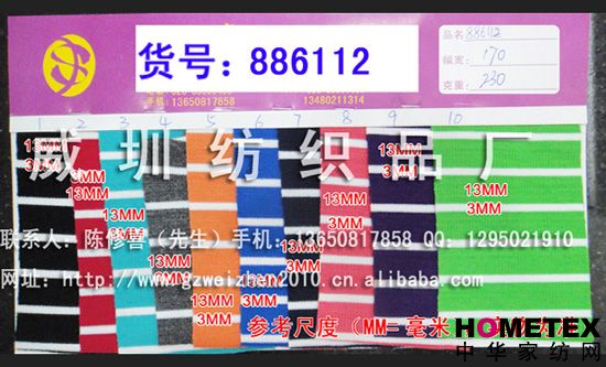 織物組織:色織 幅寬:170 密度:240T 貨號(hào):886112 具體用途:襯衫、休閑服、褲裝、內(nèi)衣、睡衣 別名:886112 成分及含量:滌棉 主要用途:服裝用布 紗支:32 ============================================================= 以上產(chǎn)品全部現(xiàn)貨供應(yīng),可隨時(shí)提供樣布卡和現(xiàn)貨,隨時(shí)發(fā)貨。所有產(chǎn)品全部是廠家直銷價(jià),我們承諾:以超低利潤(rùn)營(yíng)銷,我們只求銷售量。為保證您的利益,我司建議您在采購(gòu)前先確認(rèn)我們的品質(zhì)樣與顏色樣后再拿大貨,期待與您的真誠(chéng)合作。因產(chǎn)品種類較多,具體參考未盡詳盡,如有需要,請(qǐng)您與我們聯(lián)系。 瑞豐紡織(中大旗艦店)坐落于國(guó)內(nèi)最大的紡織面料產(chǎn)業(yè)中心—廣州中大,是一家專業(yè)銷售面料的廠家直銷商。主要經(jīng)營(yíng)產(chǎn)品有:全棉凈色、仿記憶絲面料、全棉(TC)色織等,面料品種花達(dá)上千余種,所有產(chǎn)品全部現(xiàn)貨經(jīng)營(yíng)。 我們面料的品質(zhì)來源于:1、采用國(guó)內(nèi)外優(yōu)質(zhì)的原材料;2、使用精良的生產(chǎn)工藝和設(shè)備;3、完善的生產(chǎn)質(zhì)量管理體系。我們具有開發(fā)和創(chuàng)新品種的強(qiáng)烈意識(shí)和優(yōu)越條件,并根據(jù)客戶需求與市場(chǎng)變化時(shí)時(shí)推出潮流面料。憑著多年的專業(yè)行業(yè)經(jīng)驗(yàn),根據(jù)客戶需求,不論客戶在全國(guó)任何地方,只要提供小樣,就可在一兩天時(shí)間內(nèi)輕松獲得所需面料的信息。 批發(fā)說明供應(yīng)商支持混批 。 ============================================================= 有意請(qǐng)加QQ:1295021910或電話聯(lián)系。 公司名稱:威圳紡織品廠 聯(lián)系人:陳修喜先生 手機(jī):13650817858 網(wǎng)址:http://www.gzweizhen2010.cn.alibaba.com =============================================================